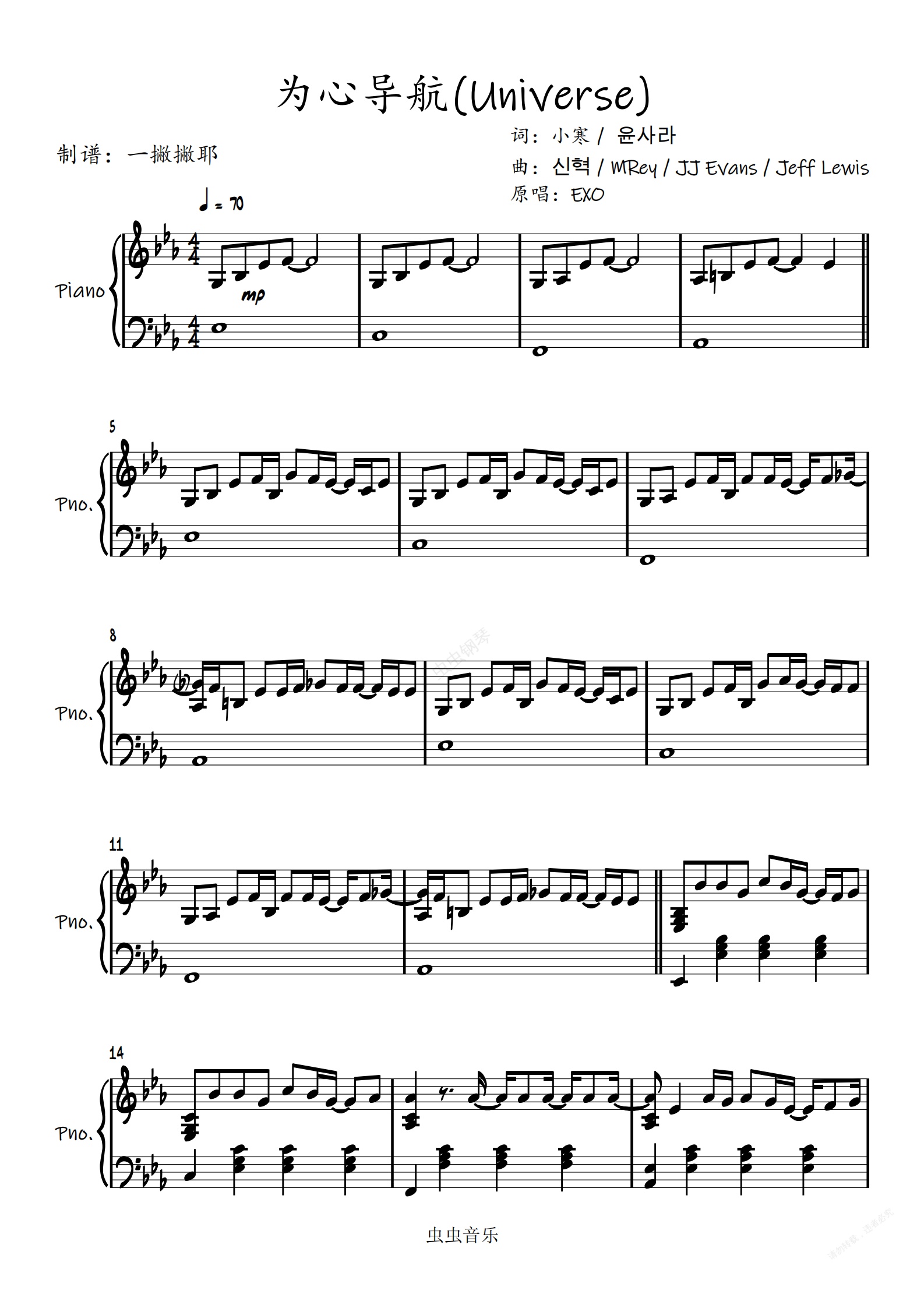 钢琴谱:Universe(为心导航)【独奏谱】EXO「一撇撇耶」