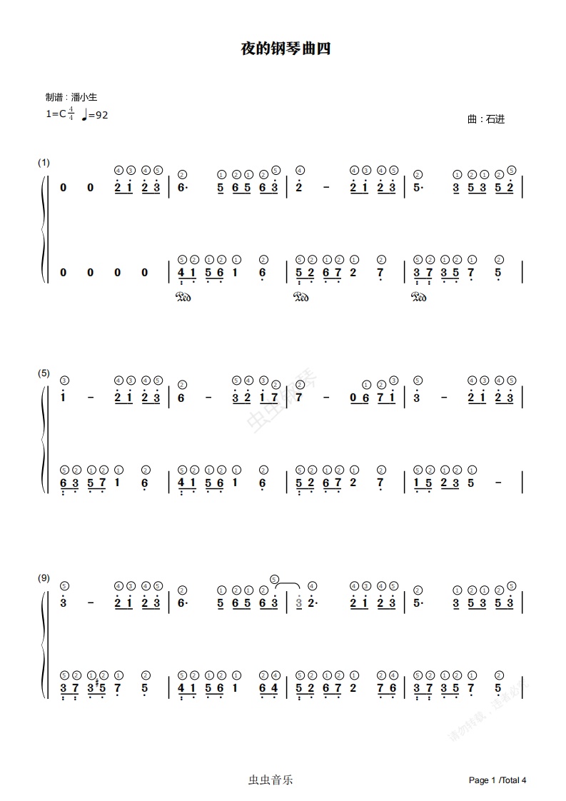 钢琴谱:[双手简谱] 夜的钢琴曲四 带指法 C调 石进