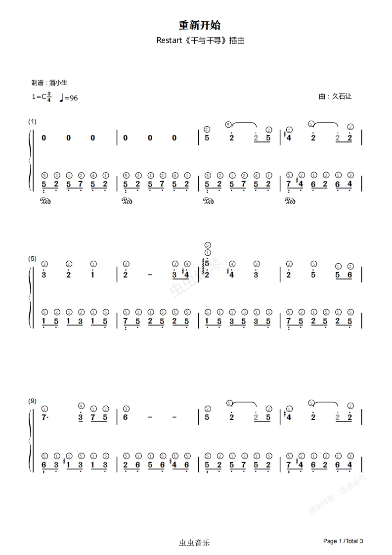 钢琴谱:[双手简谱] 重新开始 带指法 C调 千与千寻插曲 restart