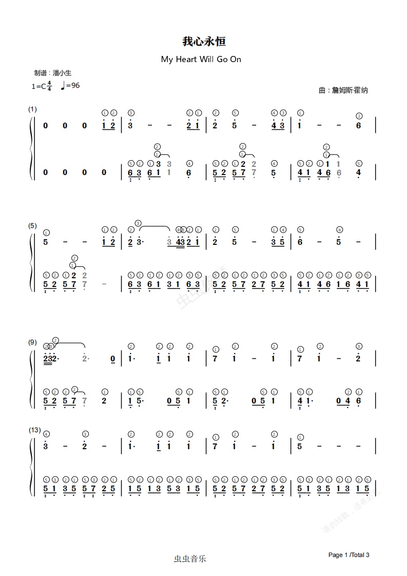 钢琴谱:[双手简谱] 我心永恒 带指法 C调 泰坦尼克号 主题曲 My Heart Will Go On