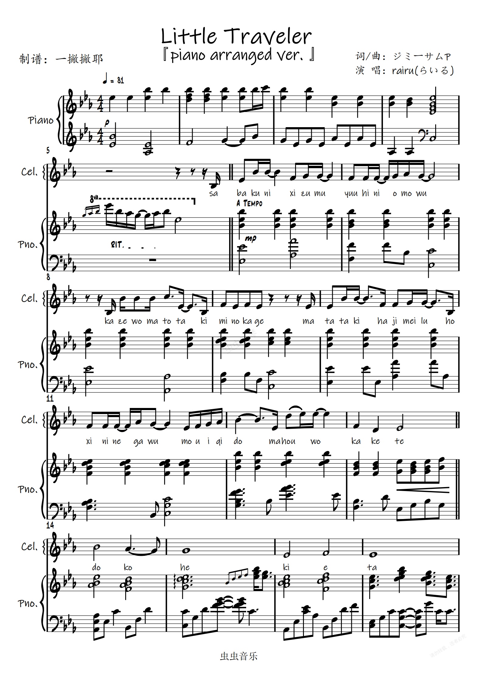 钢琴谱:Little Traveler【弹唱谱(附罗马音歌词)】rairu「一撇撇耶」