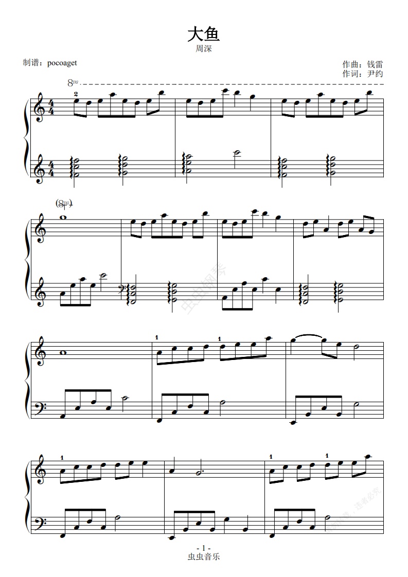 钢琴谱:《大鱼》初学者优美版(poc编配)