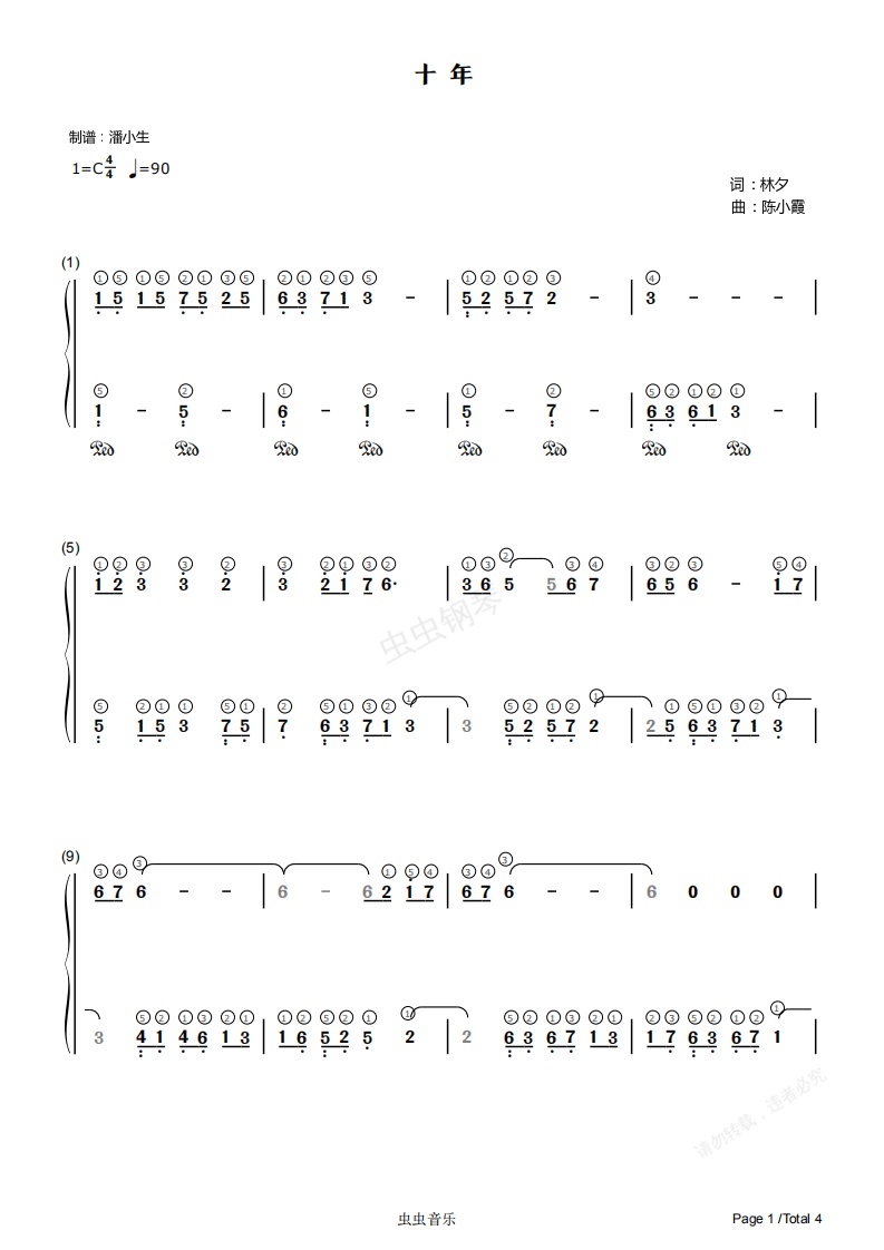 钢琴谱:[双手简谱] 十年 带指法 C调 简化版 陈奕迅