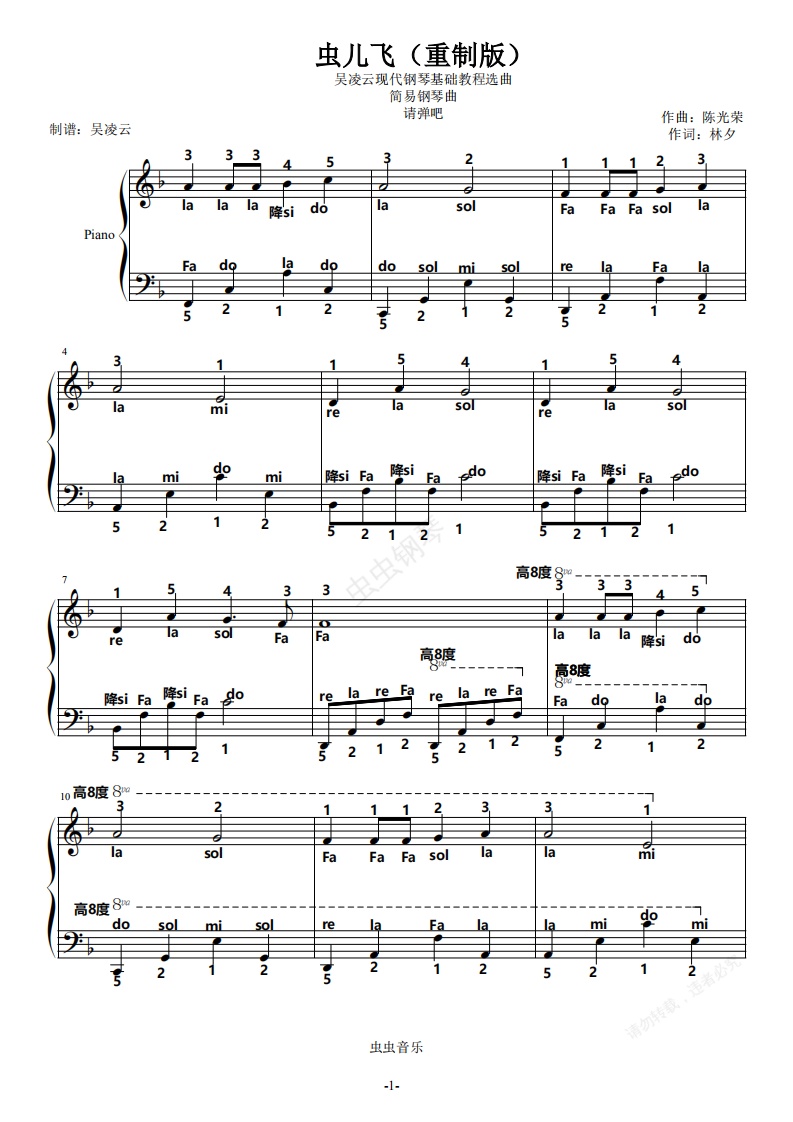 钢琴谱:虫儿飞 重制版 指法标注音符 初学者易上手钢琴谱