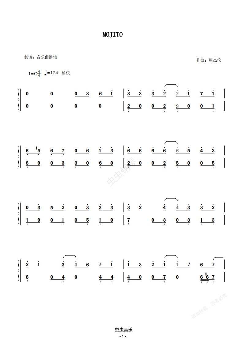 钢琴谱:MOJITO【简谱】(周杰伦 莫吉托 莫衣朵)