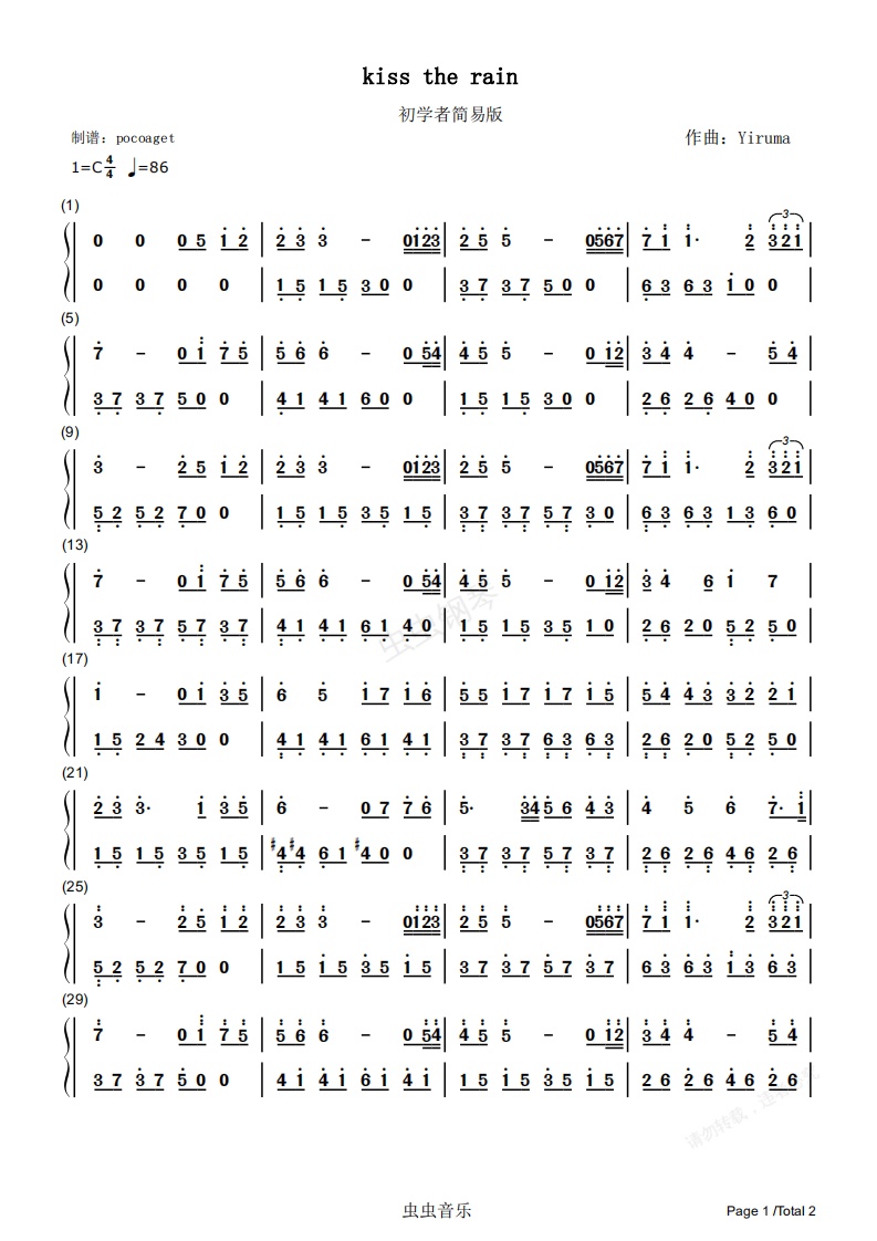 钢琴谱:kiss the rain简谱初学者简优美版(poc编配)
