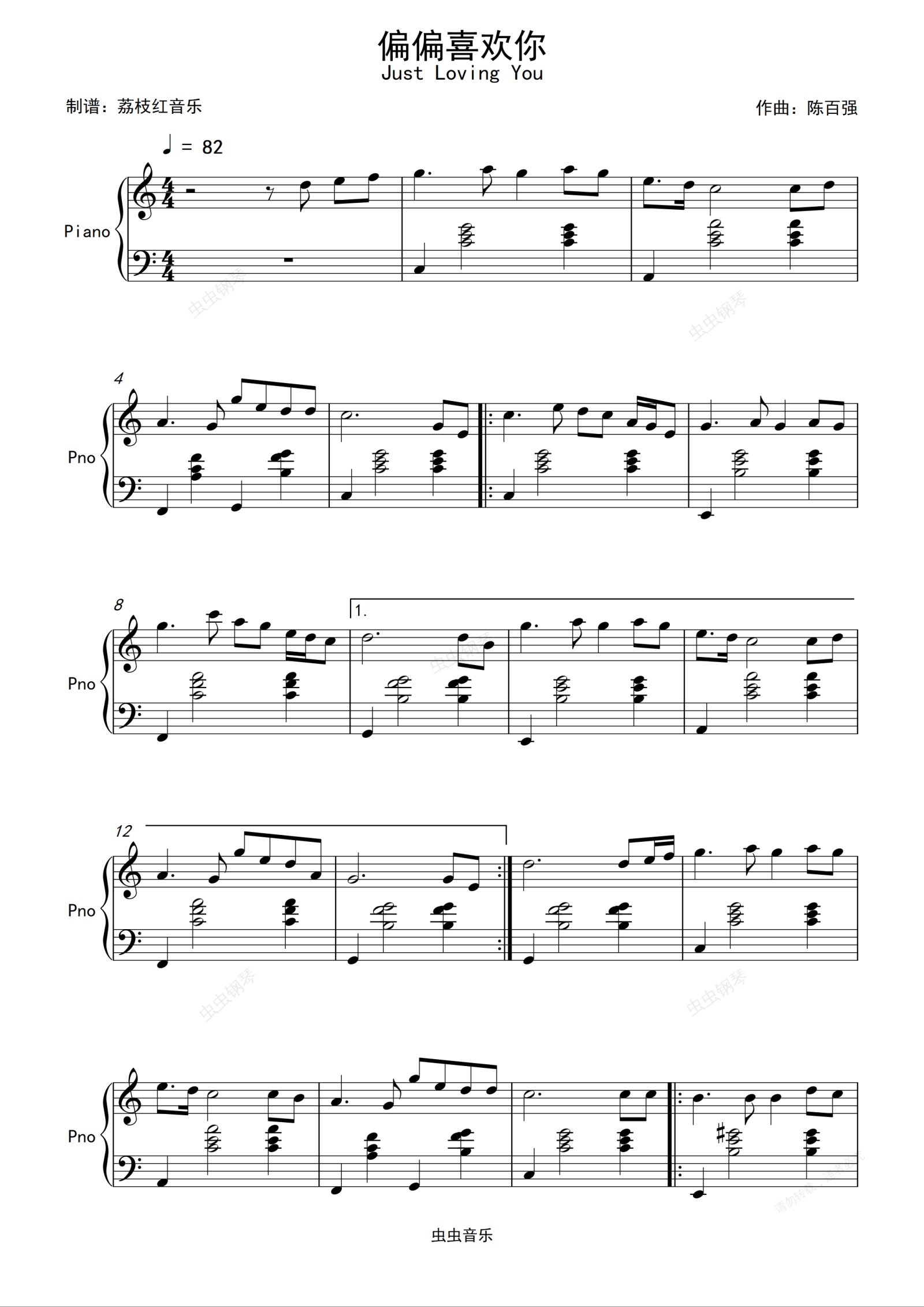 钢琴谱:最近很火的经典老歌 C大调 偏偏喜欢你-陈百强 钢琴谱 送给虫友们