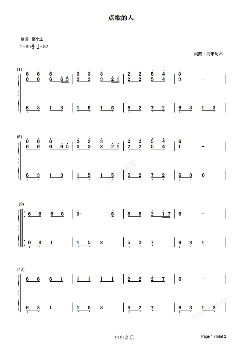 钢琴谱:(双手简谱) 点歌的人 简易版 数字独奏谱