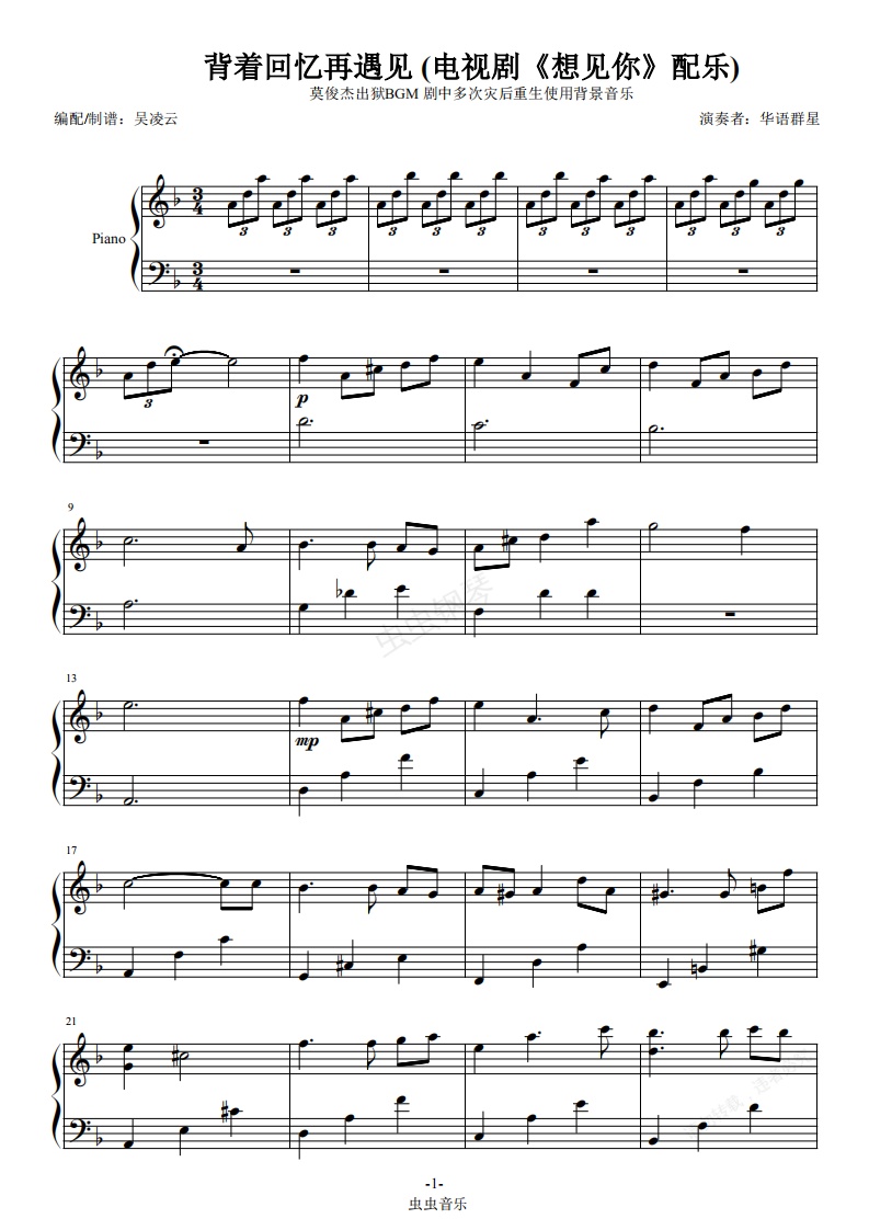钢琴谱:背着回忆再遇见 (电视剧《想见你》配乐) 莫俊杰出狱BGM 吴凌云制版