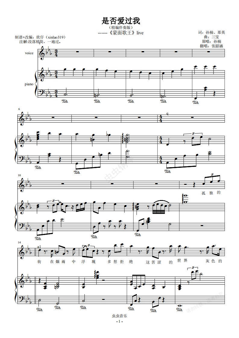钢琴谱:是否爱过我(伴)精编伴奏版《蒙面歌王》live