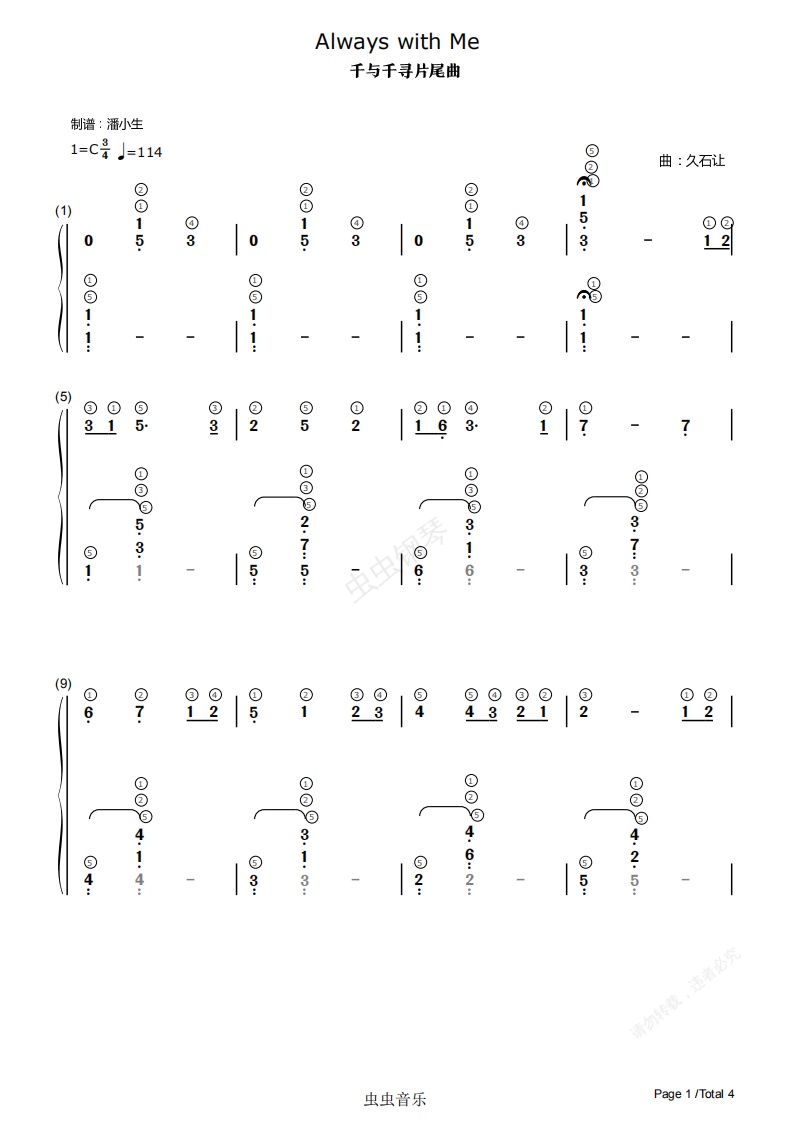 钢琴谱:[双手简谱] Always With Me 带指法 C调《千与千寻》主题曲 永远同在 亲爱的旅人啊