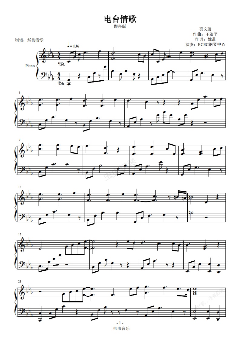 钢琴谱:【然韵音乐】电台情歌-莫文蔚 完美独奏
