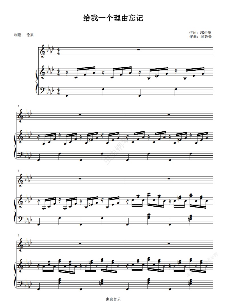 钢琴谱:A-Lin歌手版《给我一个理由忘记》钢琴弹唱谱