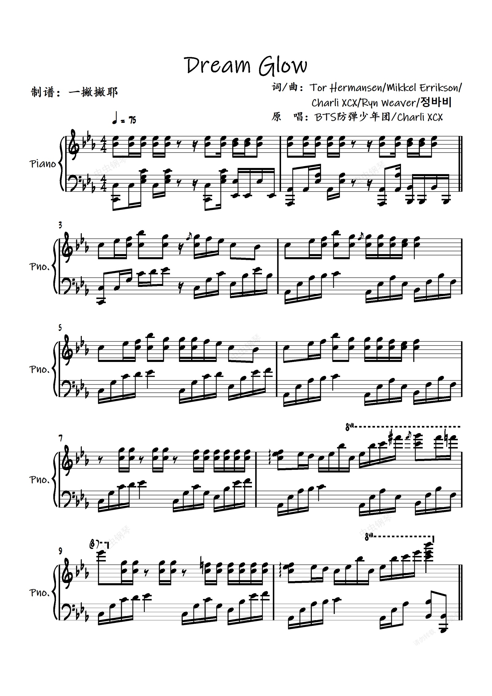 钢琴谱:Dream Glow【独奏谱】BTS防弹少年团/Charli XCX「一撇撇耶」