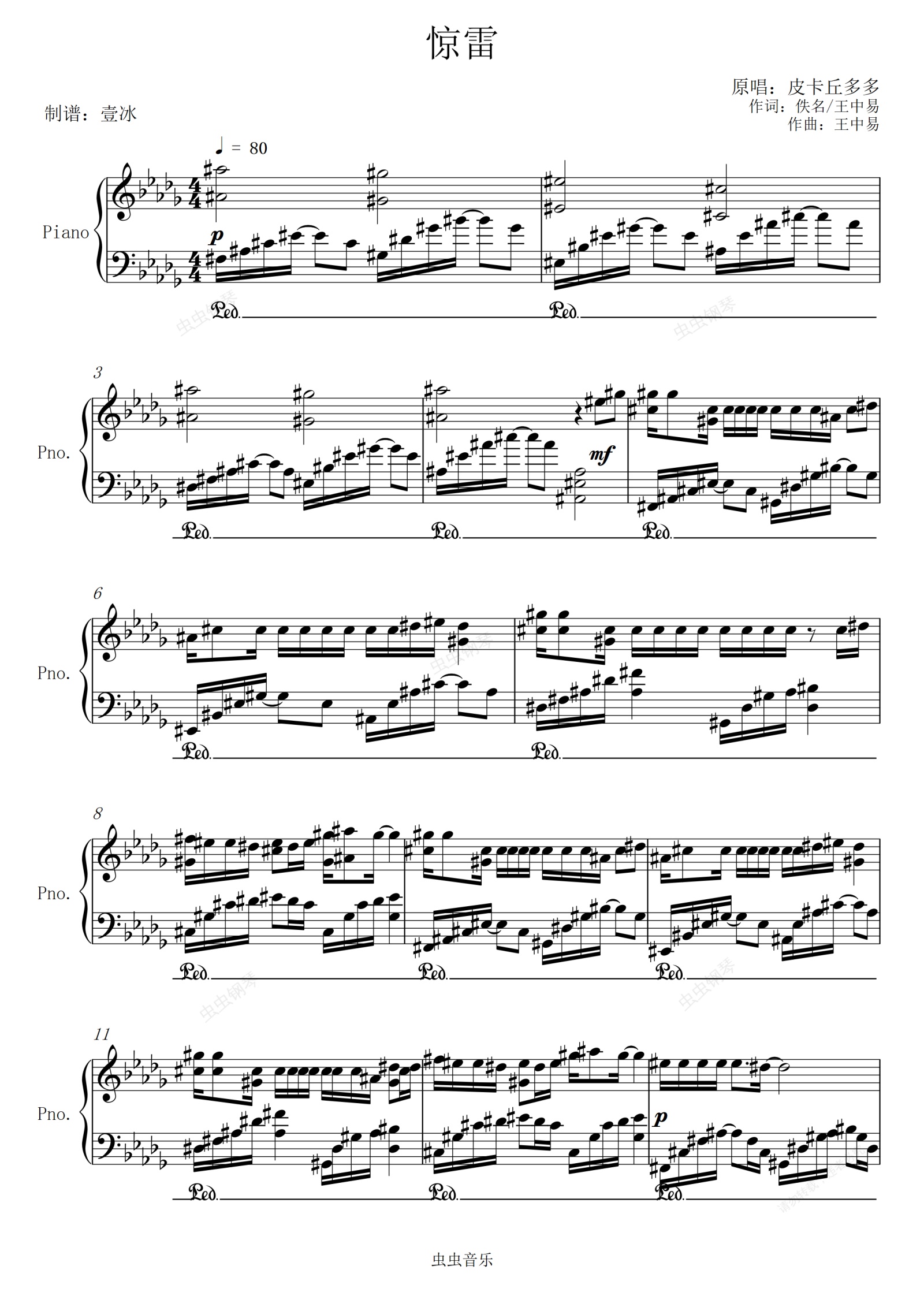 钢琴谱:惊雷//抒情版原唱皮卡丘多多-升C钢琴版壹冰