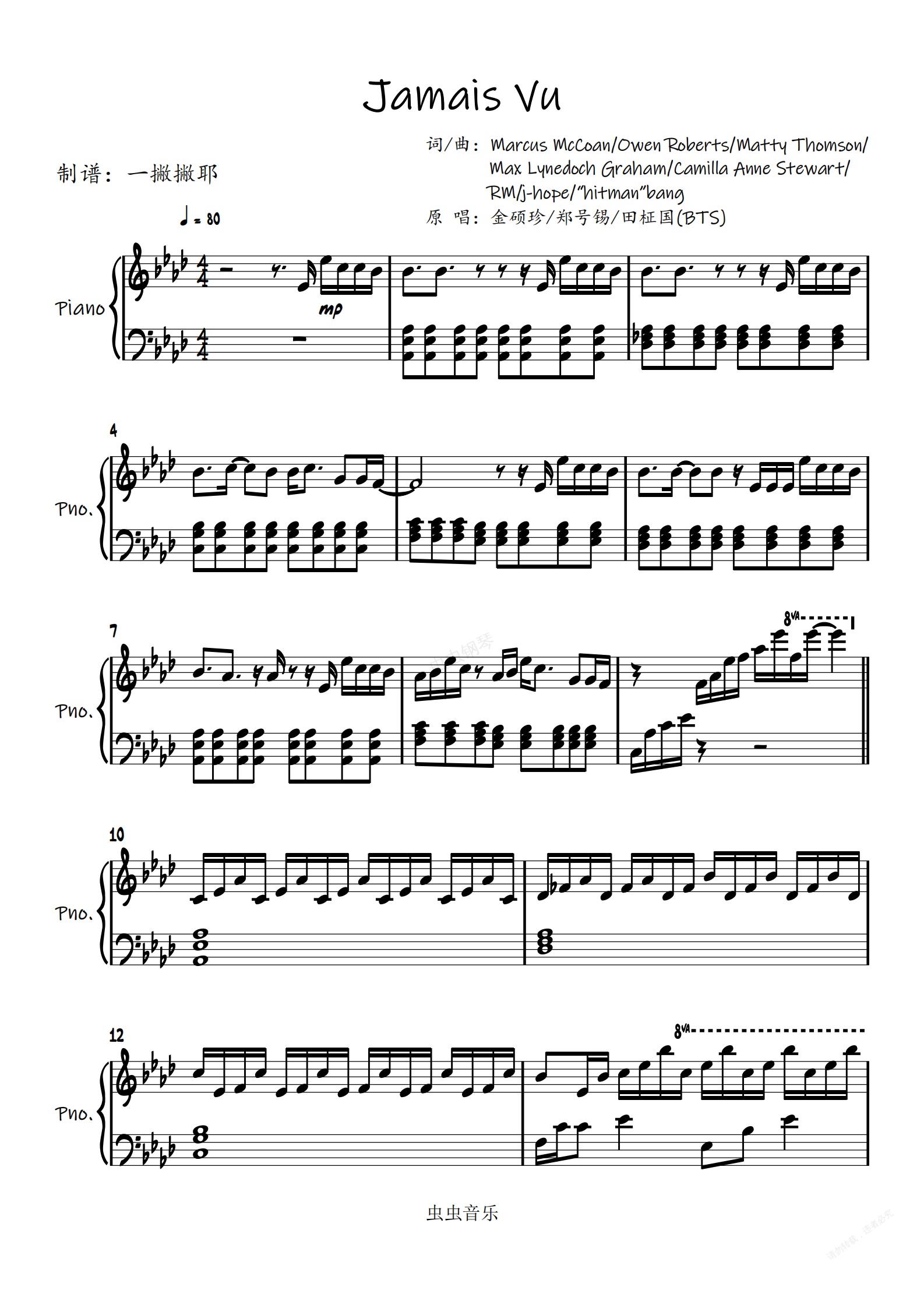 钢琴谱:Jamais Vu【独奏谱】金硕珍/郑号锡/田柾国(BTS防弹少年团)「一撇撇耶」