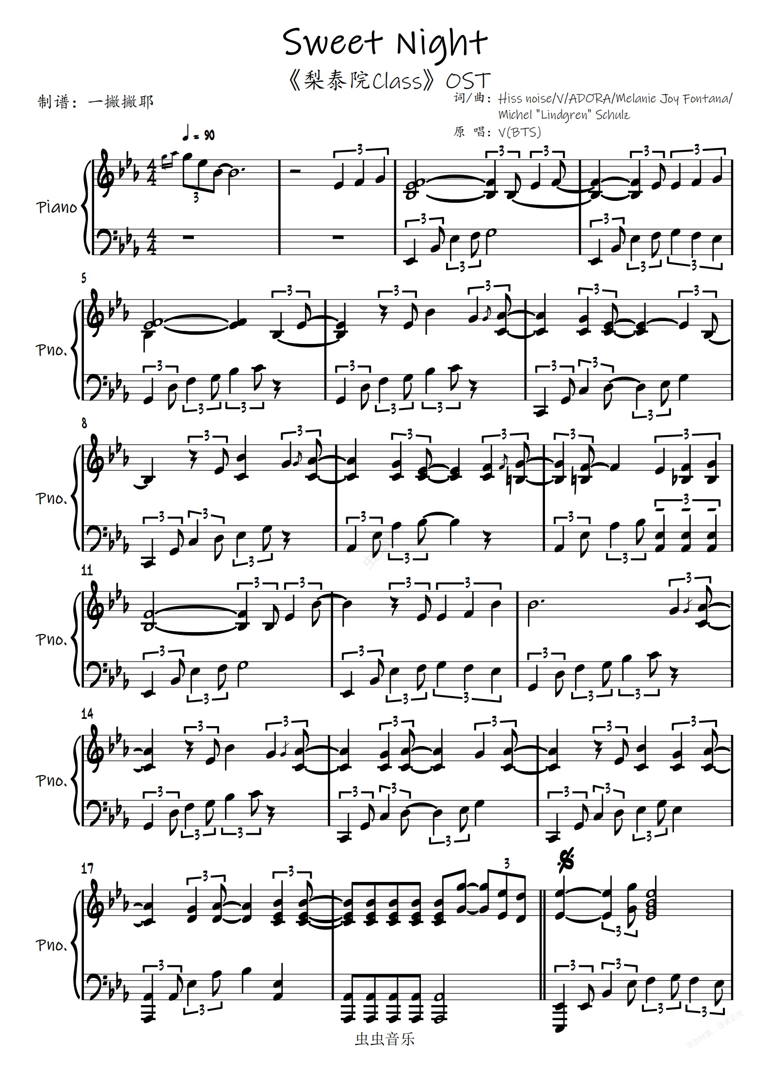 钢琴谱:Sweet Night【独奏谱】V金泰亨(BTS防弹少年团)「一撇撇耶」