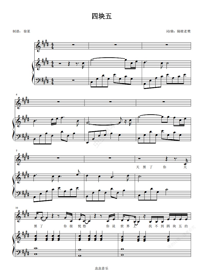 钢琴谱:经典神曲 隔壁老樊《四块五》钢琴弹唱谱