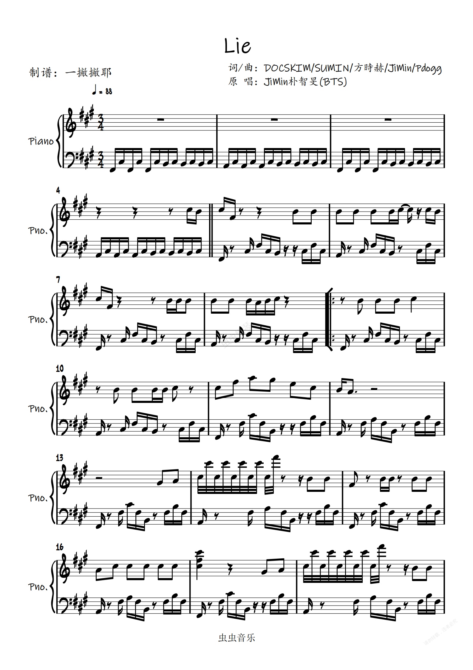 钢琴谱:Lie【独奏谱】JiMin 朴智旻(BTS防弹少年团)「一撇撇耶」