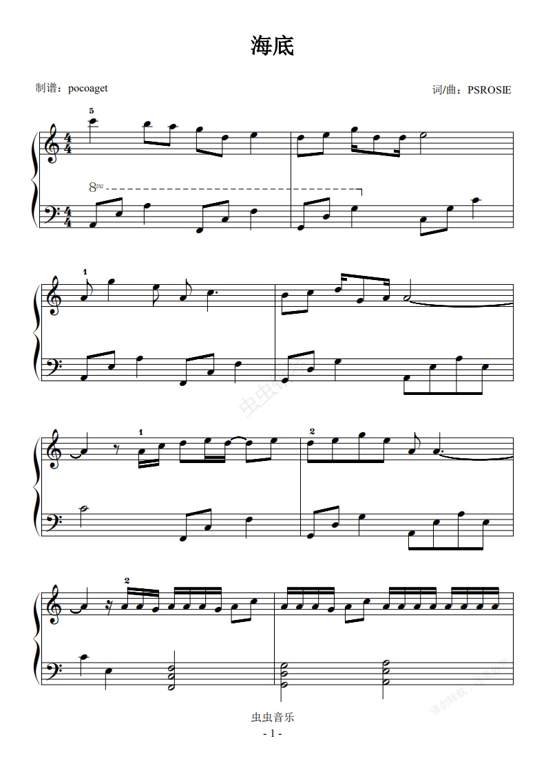 钢琴谱:《海底》一只榴莲/网易音乐最火单曲。(poc编配)