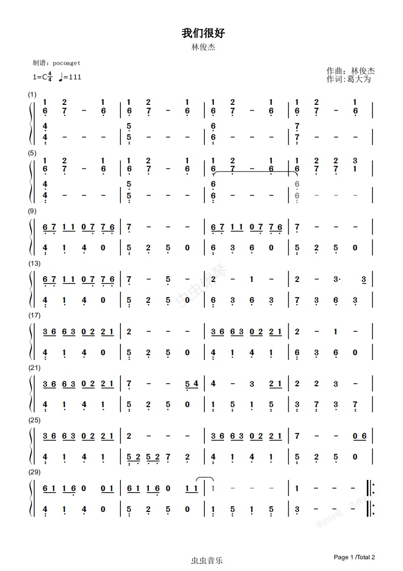 钢琴谱:《我们很好》简谱、易上手C调版(poc编配)
