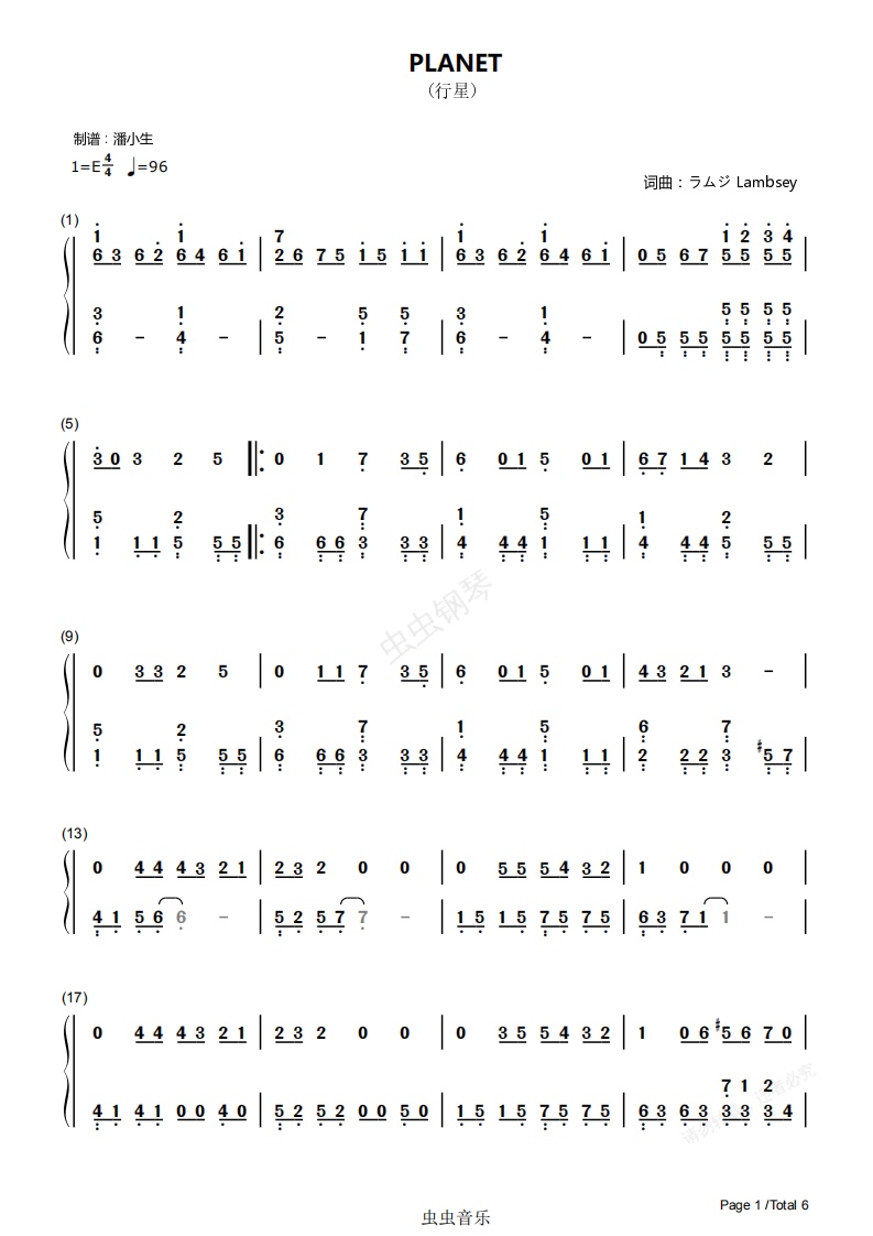 钢琴谱:[双手简谱] PLANET ラムジ 行星 原调 独奏版