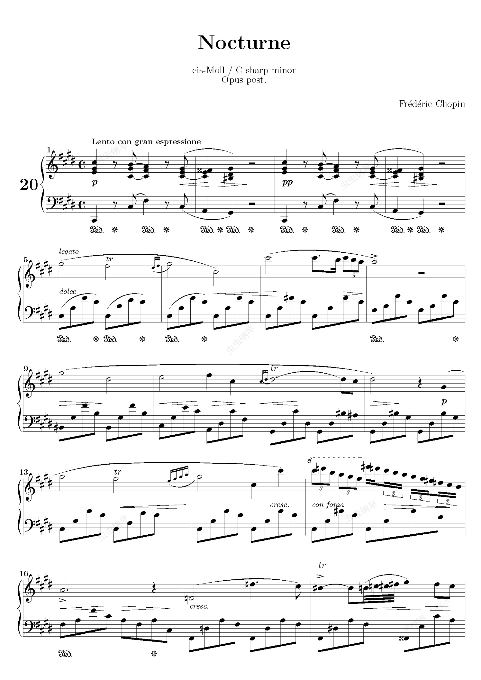 钢琴谱:Nocturnes.20 升c小调 P 1 No. 16 肖邦夜曲 Frédéric François Chopin
