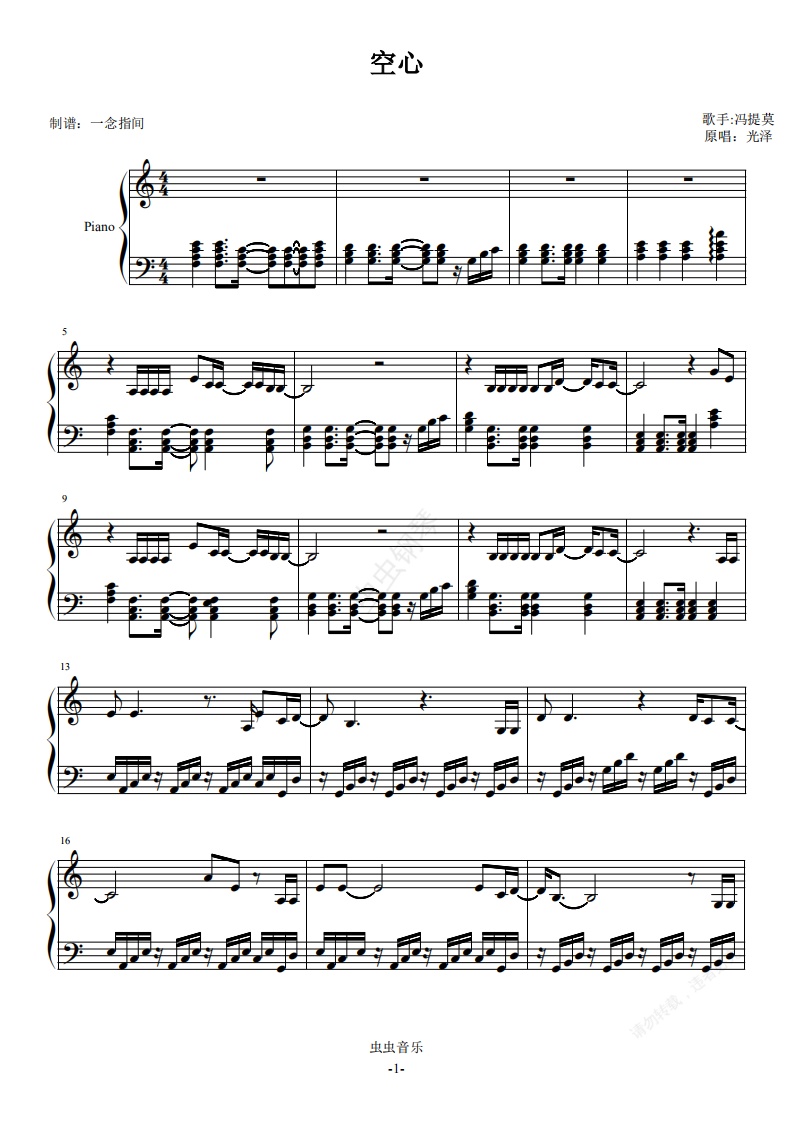 制谱:一念指间 乐谱标记:TJ520 谱子制作版本是冯提莫在《蒙面唱将猜猜猜》第三期中Live演唱的版本,冯提莫扮演唱将“小了白了兔”,舞台上她独唱的《空心》完整释放出她在高音处的爆发力,低沉处的温柔婉转又把握地恰到好处. 在第一次听这首歌的时候真的是听哭了,这首歌旋律真的好听,就认认真真的把这首歌包括里面的和声都仔细扒出来。