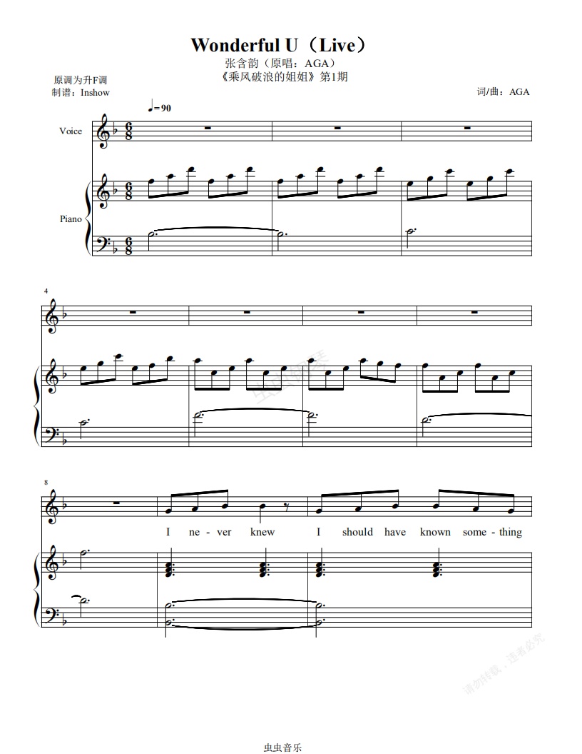 钢琴谱:Wonderful U【F调】(《乘风破浪的姐姐》)【弹唱谱】