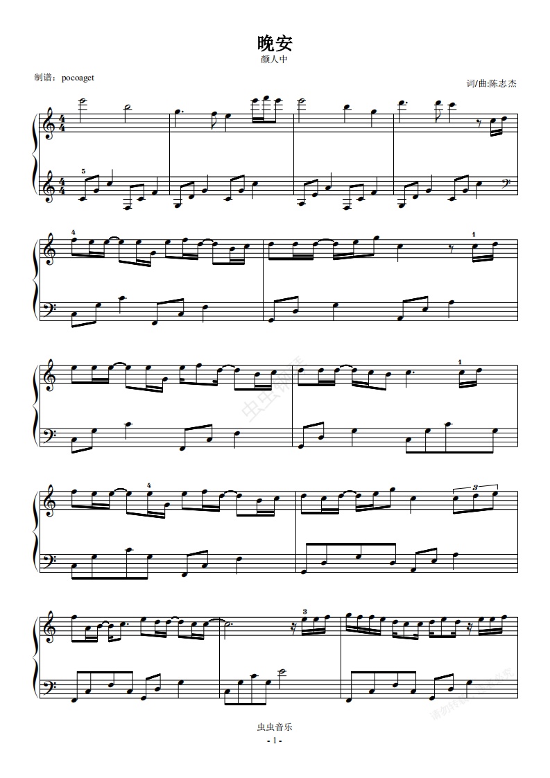 钢琴谱:《晚安》颜人中,适合初学者唯美版(poc编配)