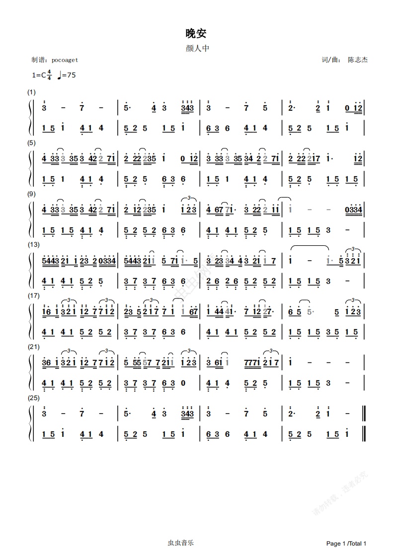 钢琴谱:《晚安》颜人中简谱,适合初学者唯美版(poc编配)