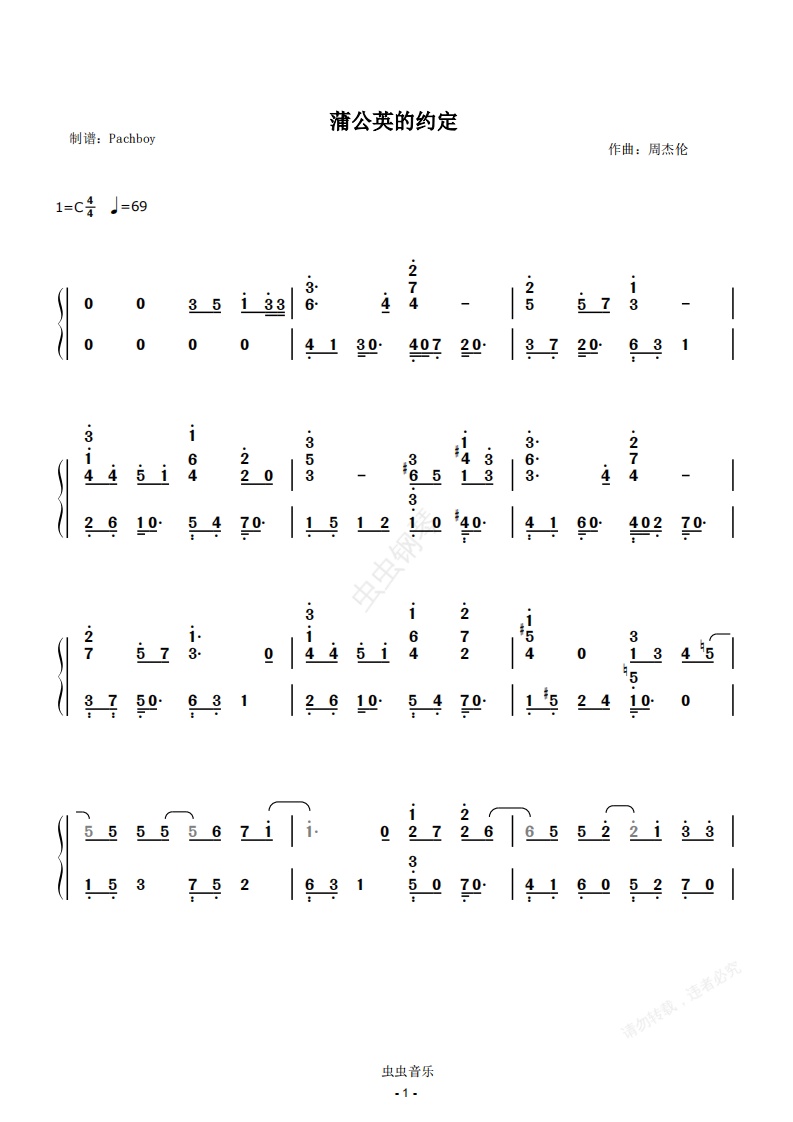 钢琴谱:蒲公英的约定【简谱定制】周杰伦
