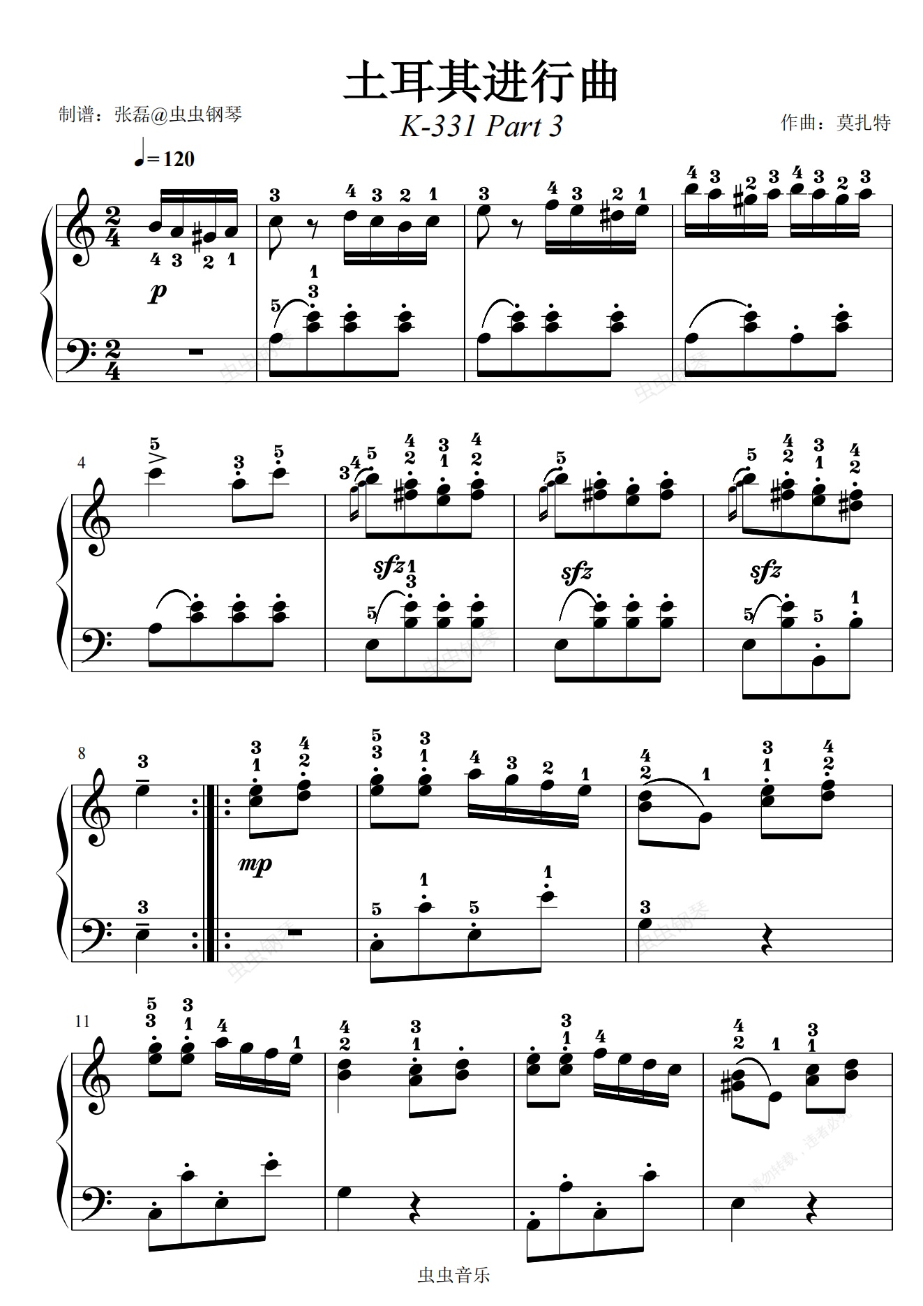 钢琴谱:土耳其进行曲(原版带指法)--莫扎特Piano Sonata No. 11 in A Major, K. 331: III. Rondo "Alla Turca"