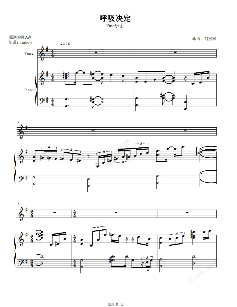 钢琴谱:Fine乐团 - 呼吸决定【G调弹唱谱】
