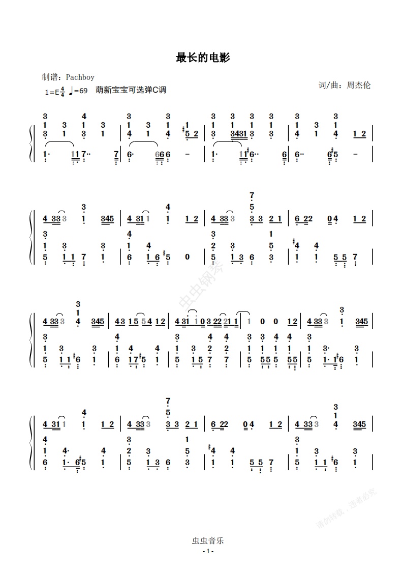 钢琴谱:最长的电影【双手简谱】周杰伦