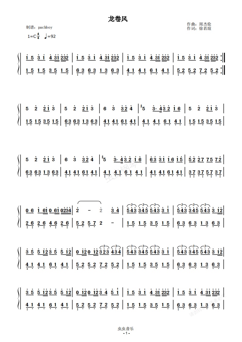 钢琴谱:龙卷风【双手简谱】无敌洗脑 周杰伦 JAY