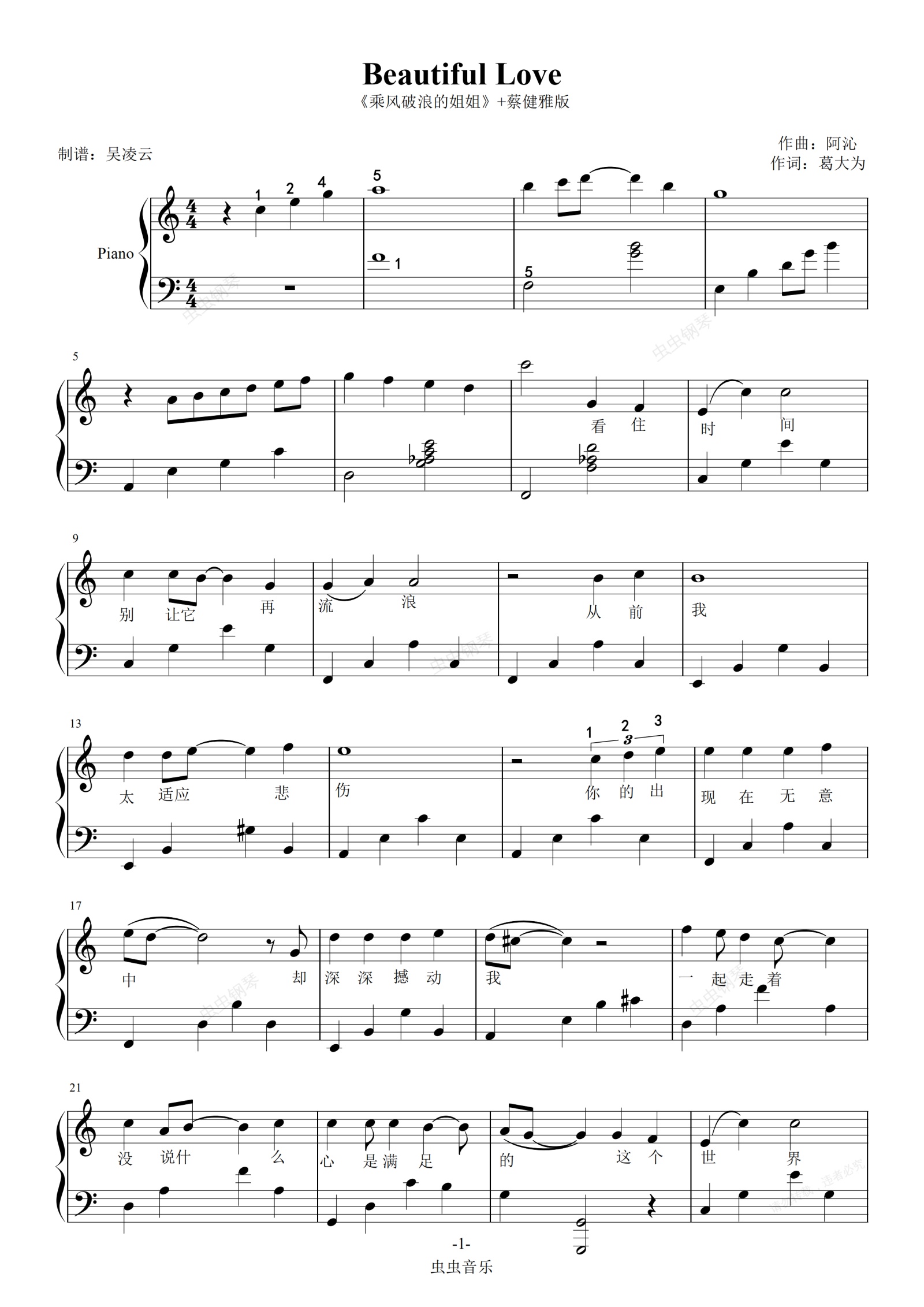 钢琴谱:Beautiful love 易上手版 带指法 附歌词 蔡健雅/乘风破浪姐姐 吴凌云制