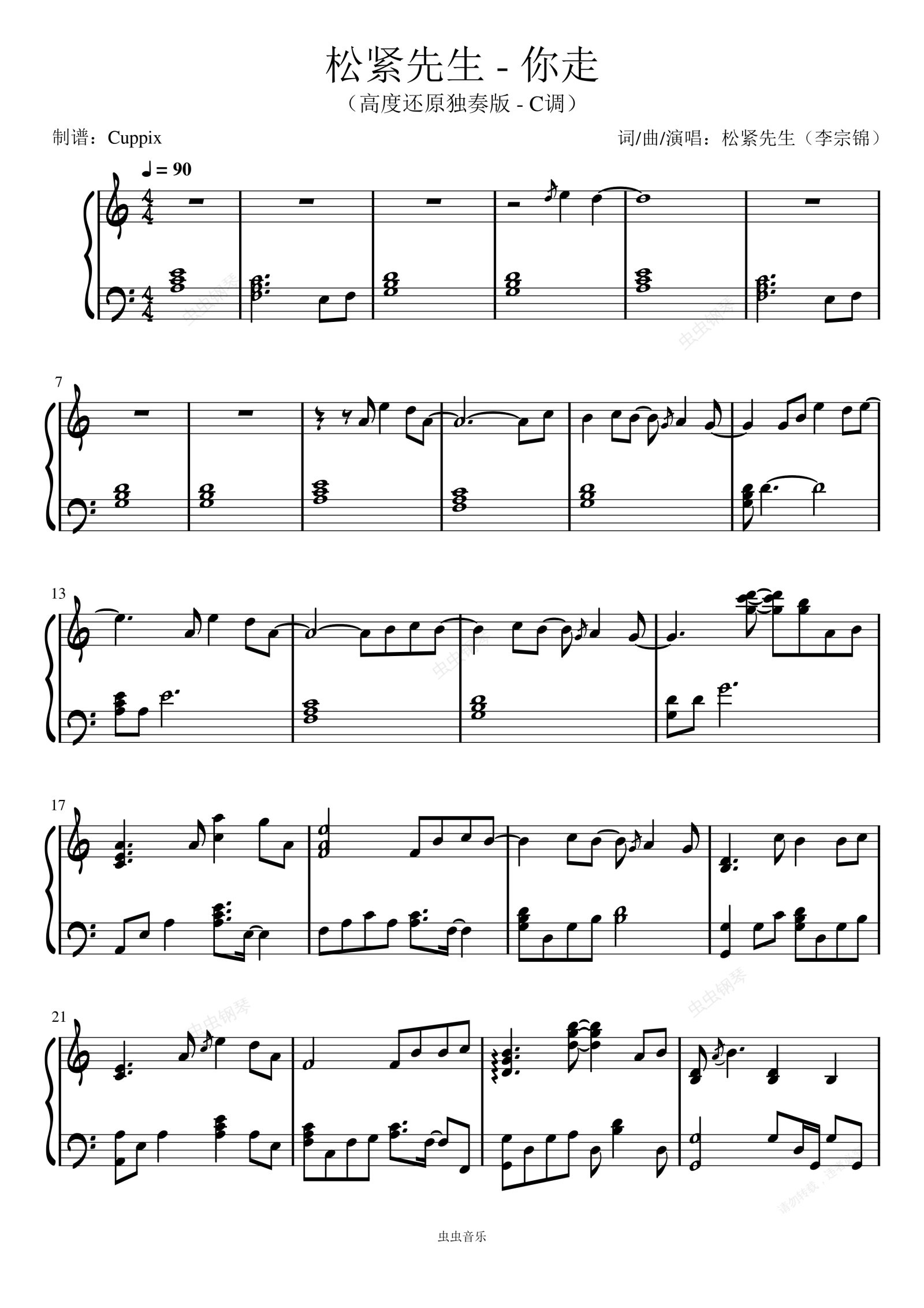 钢琴谱:松紧先生《你走》高燃独奏版-C调(Cuppix改编 完美还原 李宗锦)