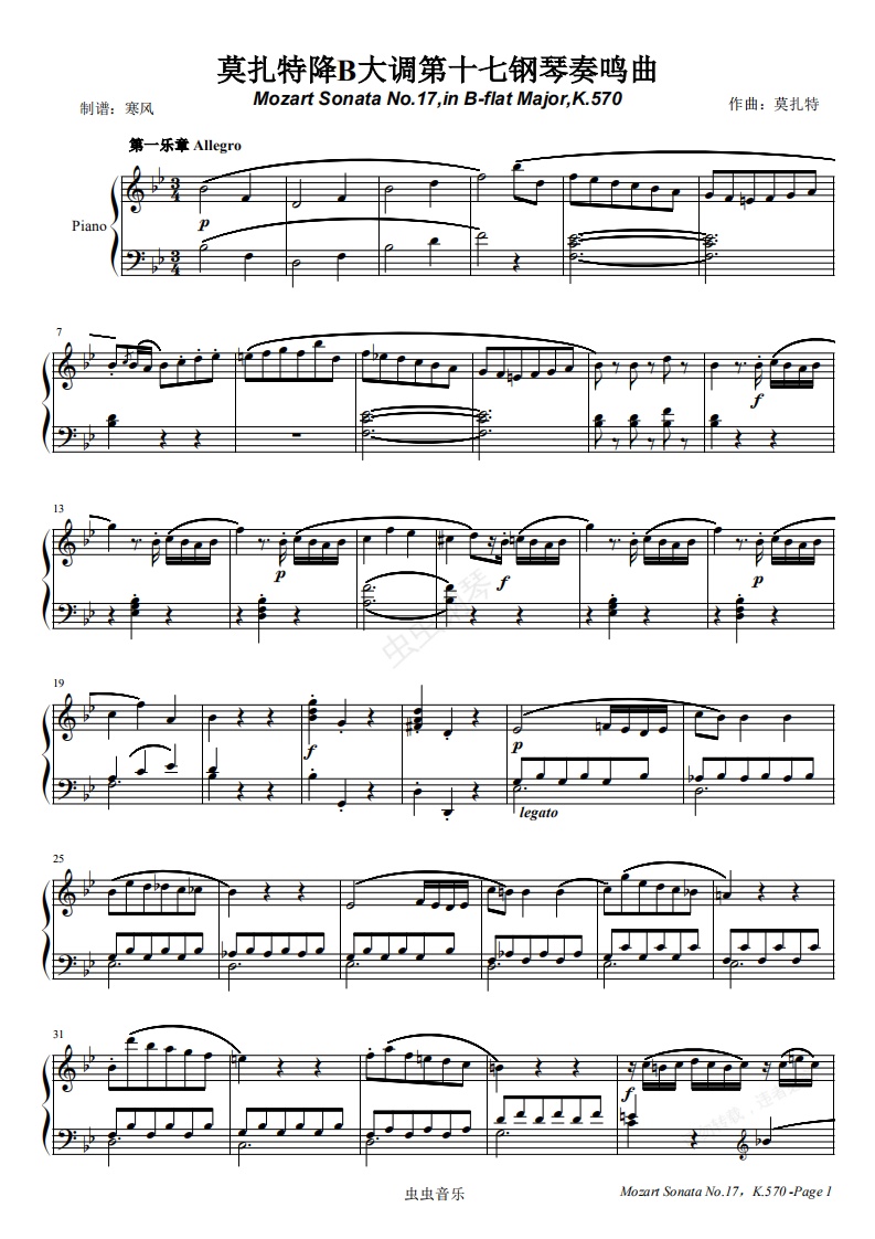 钢琴谱:莫扎特降B大调第十七钢琴奏鸣曲K.570(附指法)