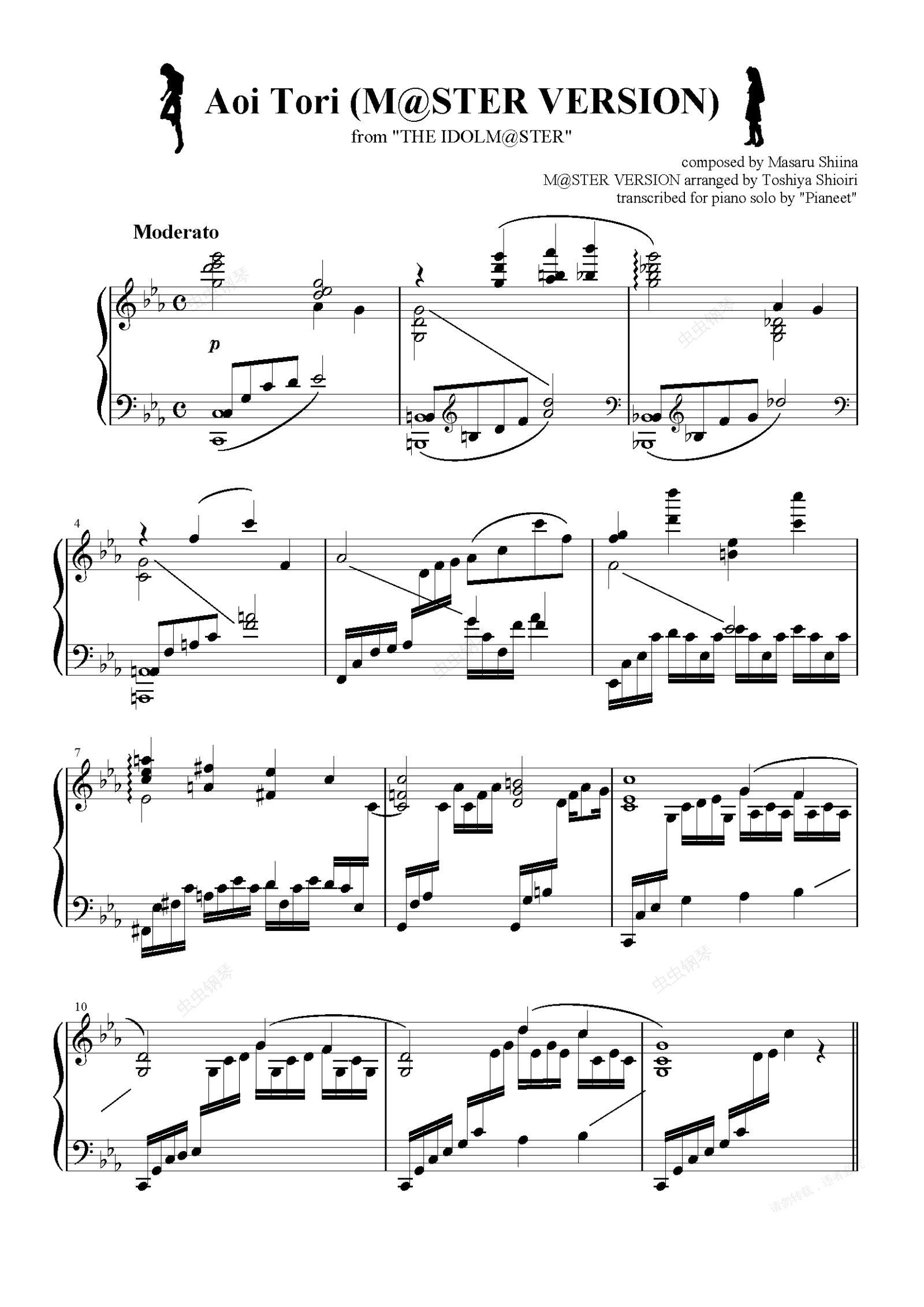 偶像大师椎名豪的神曲。这个谱子我只能说是神曲+神改编,简直是强的毫无人性。编谱者是我非常喜欢的一个钢琴家森下唯,这个谱子原地址://He/so/&key=aoitori,也是少数公开的。这首曲子声部结构十分复杂,我原本想要重新打谱的但后来发现如果强行把声部分开写反而阅读不方便,所以有想要练习的可以参考音频。音频来自,,