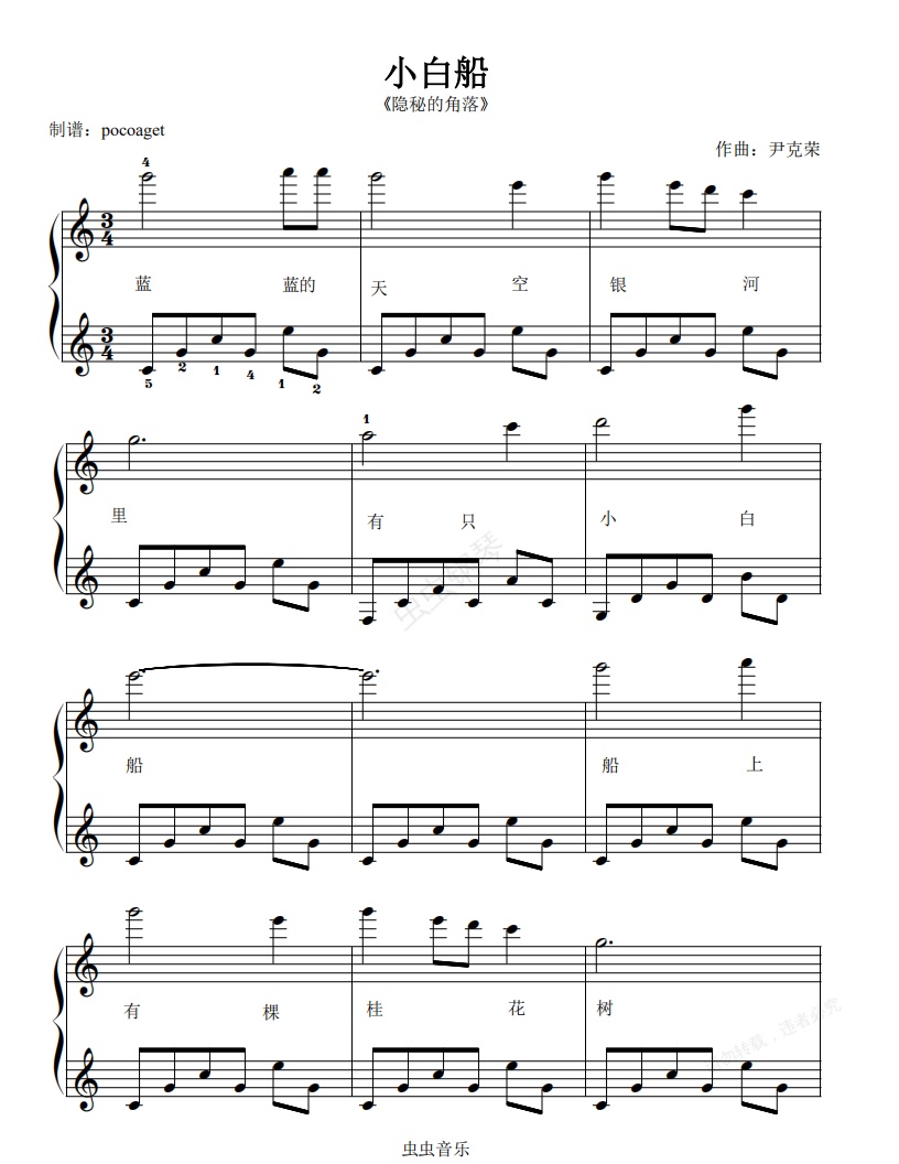 钢琴谱:《小白船》带歌词。隐秘的角落插曲,初学者优美版(poc编配)
