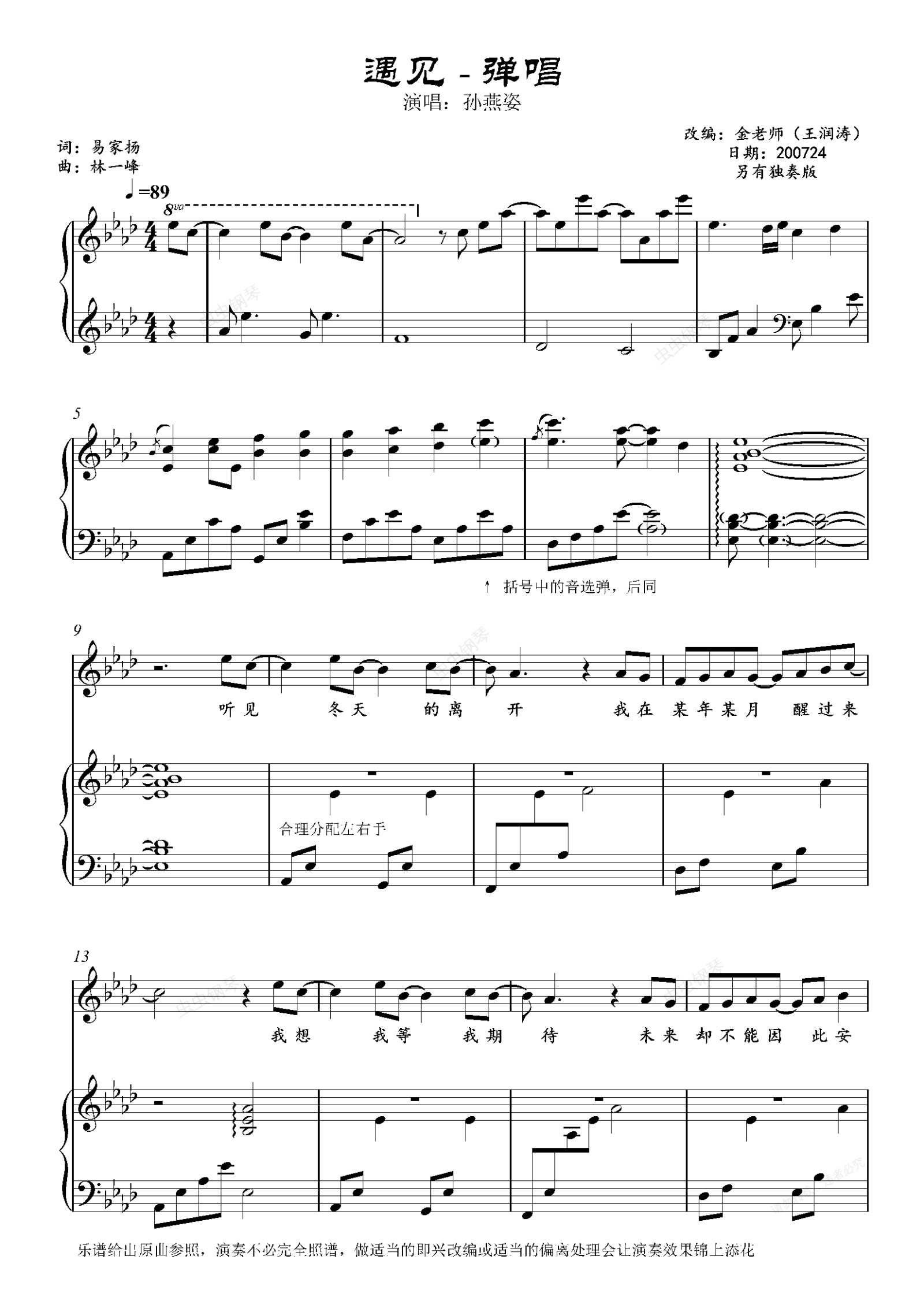 钢琴谱:遇见-金老师弹唱谱200724