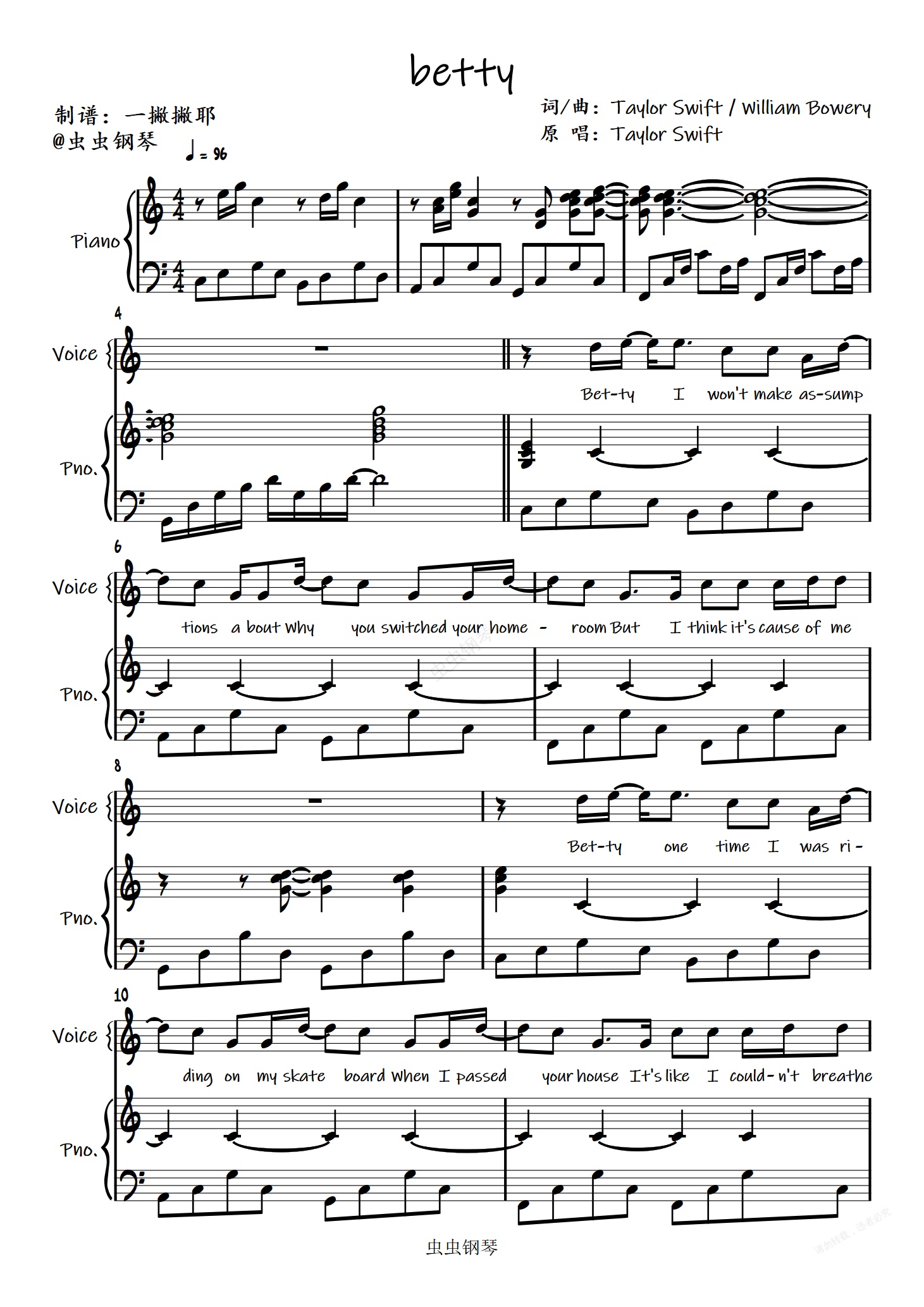 钢琴谱:betty【弹唱谱】Taylor Swift泰勒·斯威夫特∣霉霉ts8-folklore「一撇撇耶」