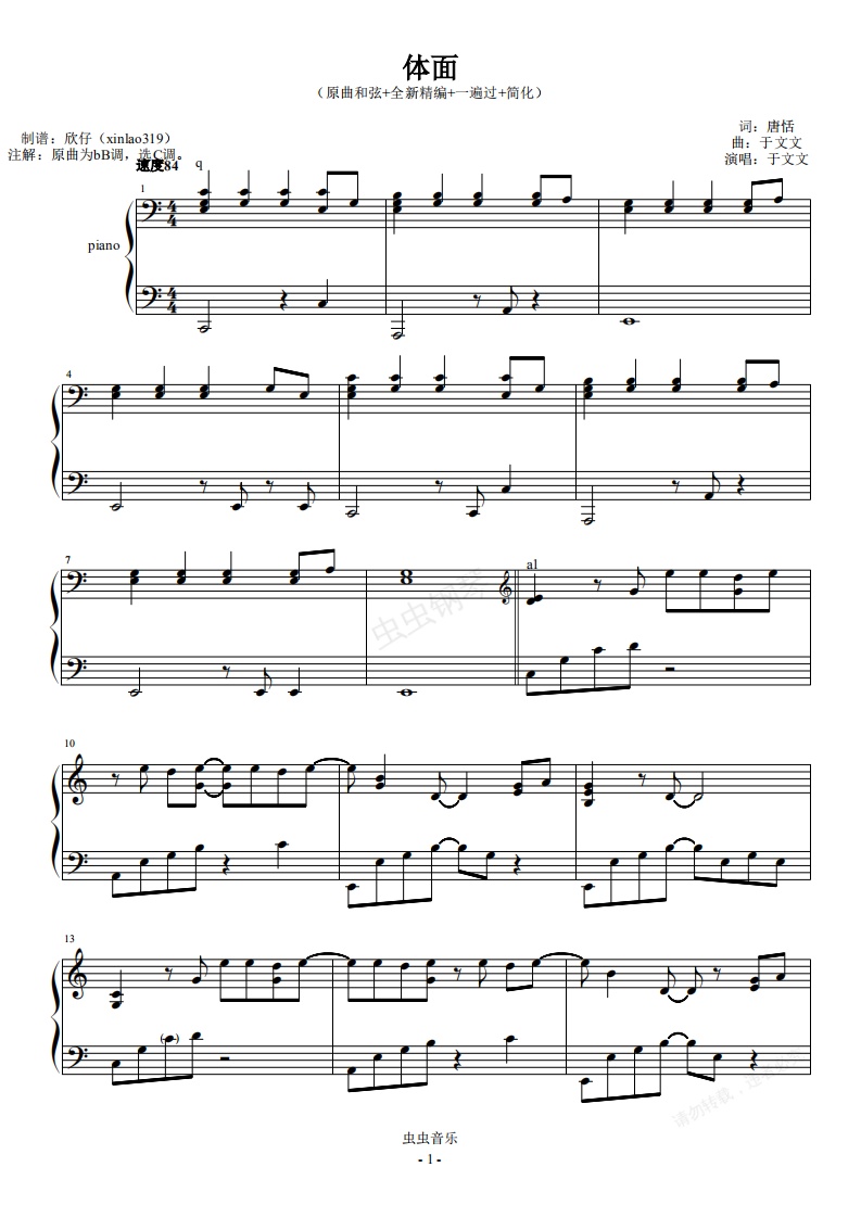 钢琴谱:体面-C调(原曲和弦+全新精编+一遍过+简易版)