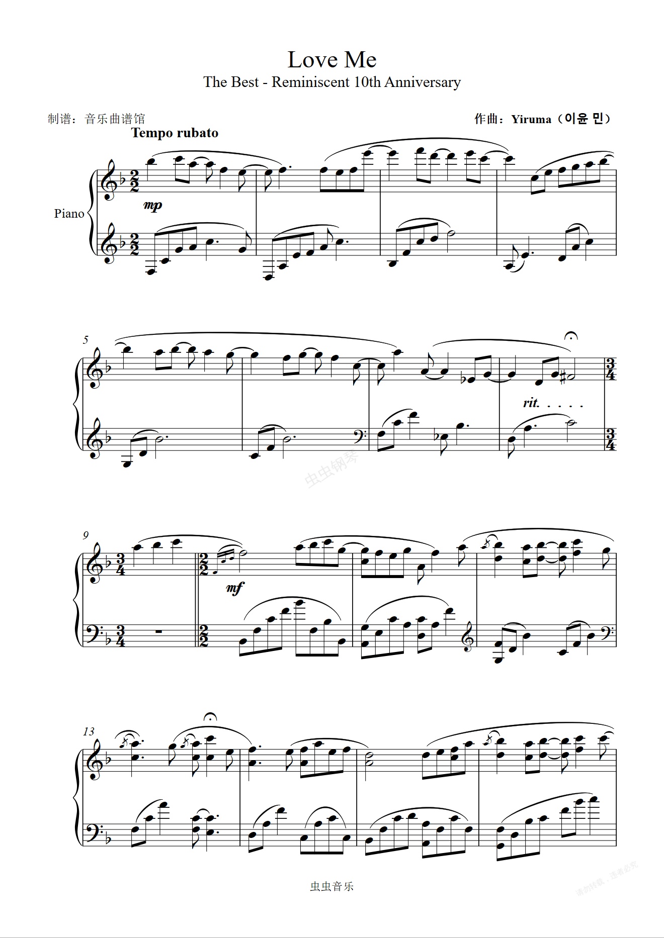 钢琴谱:Love Me【十周年版】10周年专辑精选 The Best - Reminiscent 10th Anniversary 10周年版 Yiruma 李闰珉