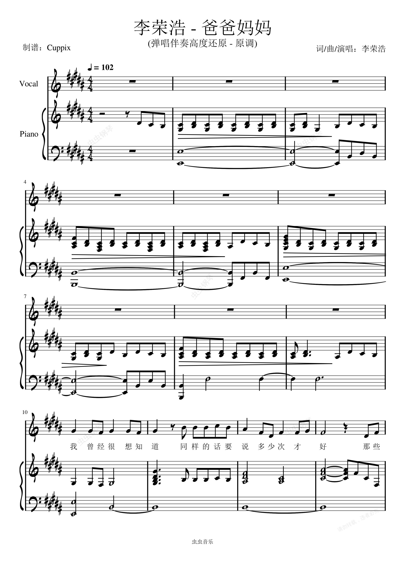 钢琴谱:李荣浩 - 爸爸妈妈(弹唱伴奏附词 - 原调)超高还原版