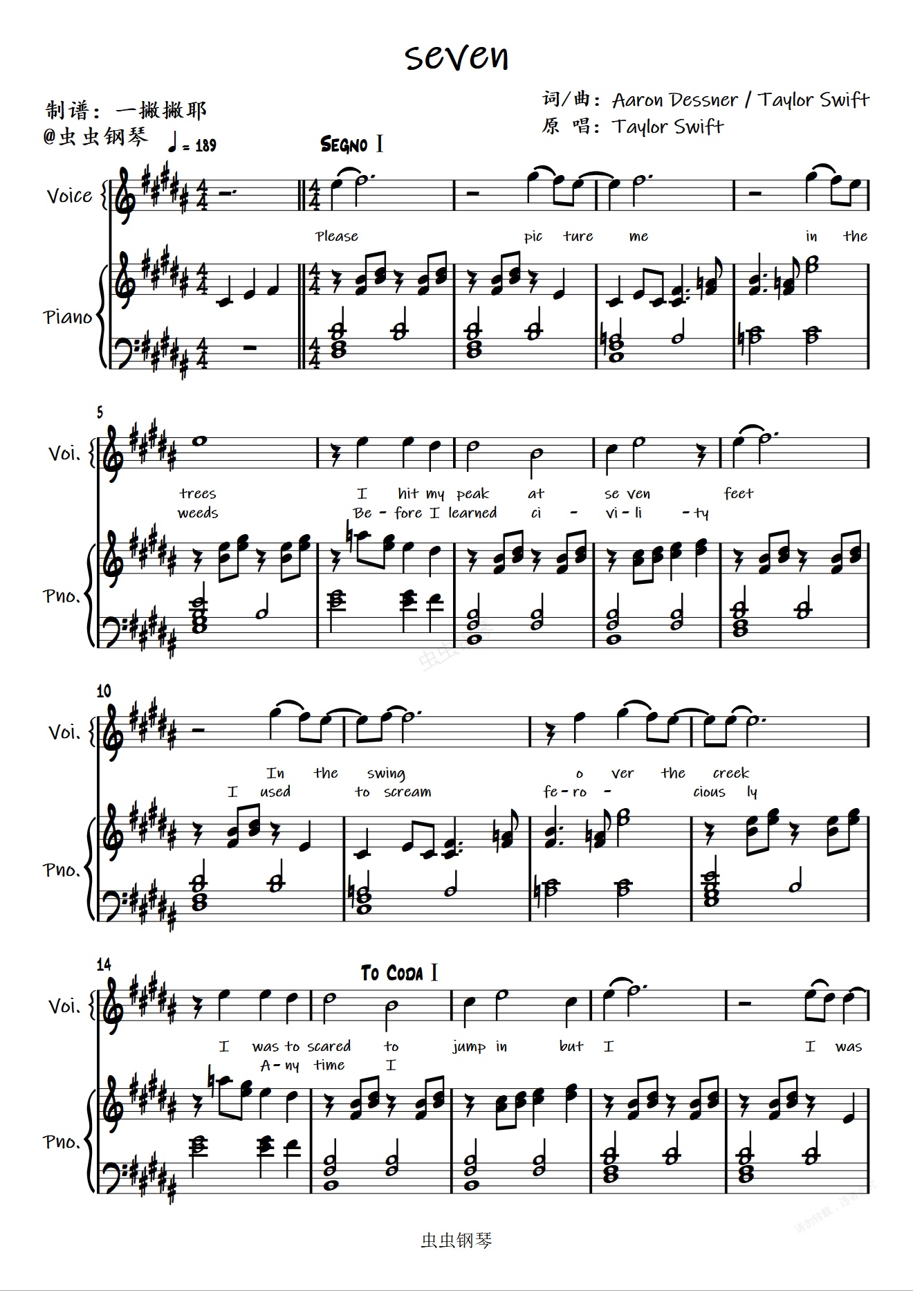 钢琴谱:seven【弹唱谱】Taylor Swift泰勒·斯威夫特∣霉霉folklore「一撇撇耶」