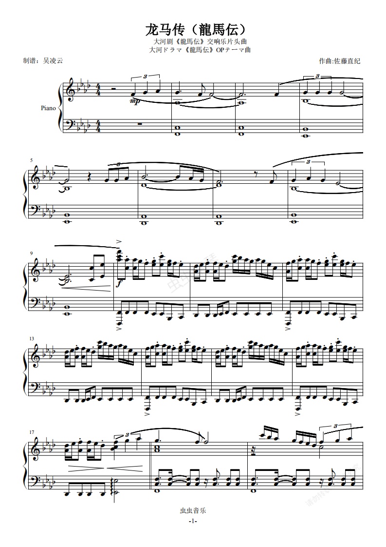 钢琴谱:龙马传(龍馬伝)日本大河剧片头曲交响乐钢琴版 吴凌云编制版
