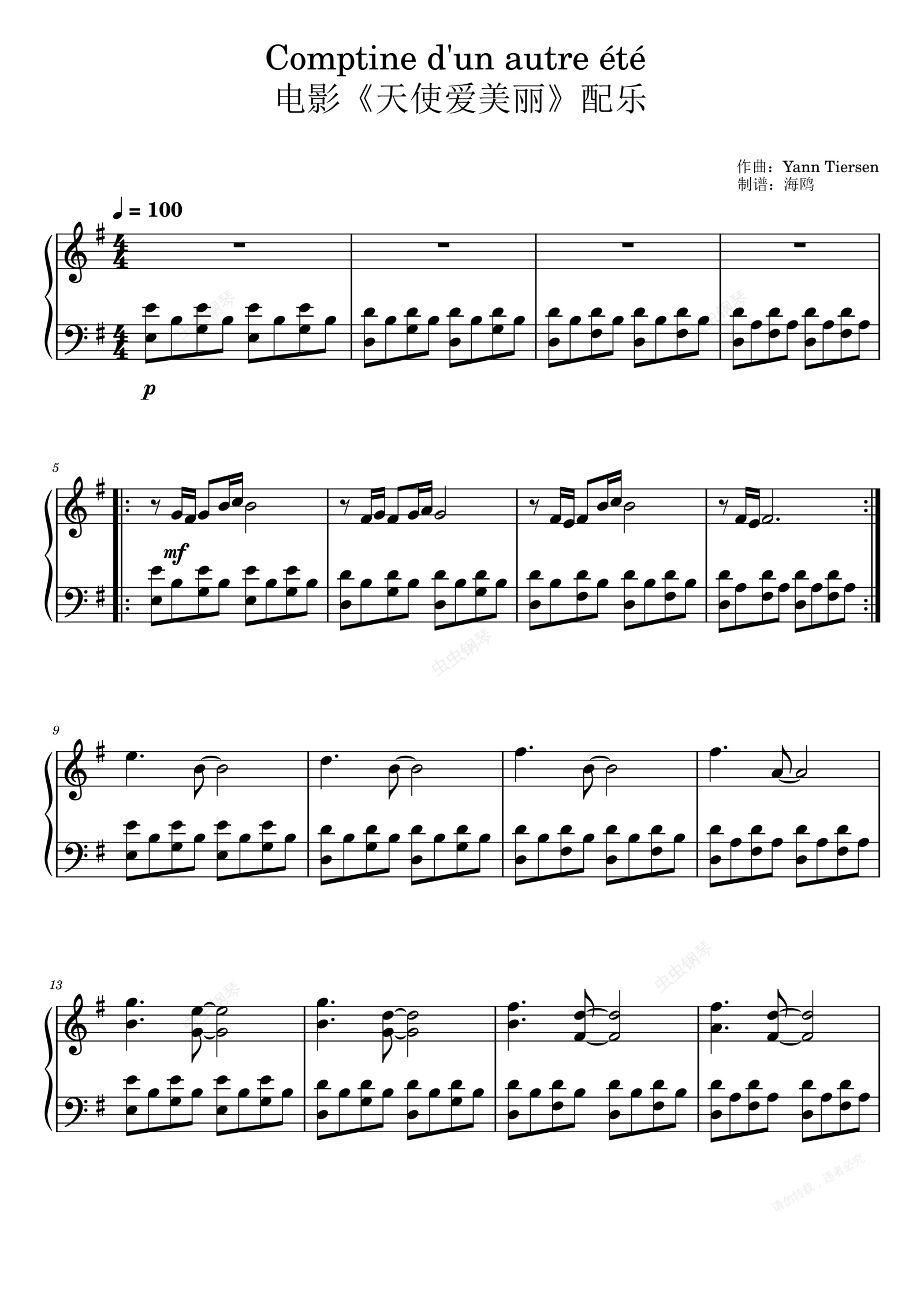 钢琴谱:电影《天使爱美丽》配乐Comptine d'un autre été, l'après-midi 另一个夏天的童谣 Yann Tiersen 收藏 雅恩-提尔森