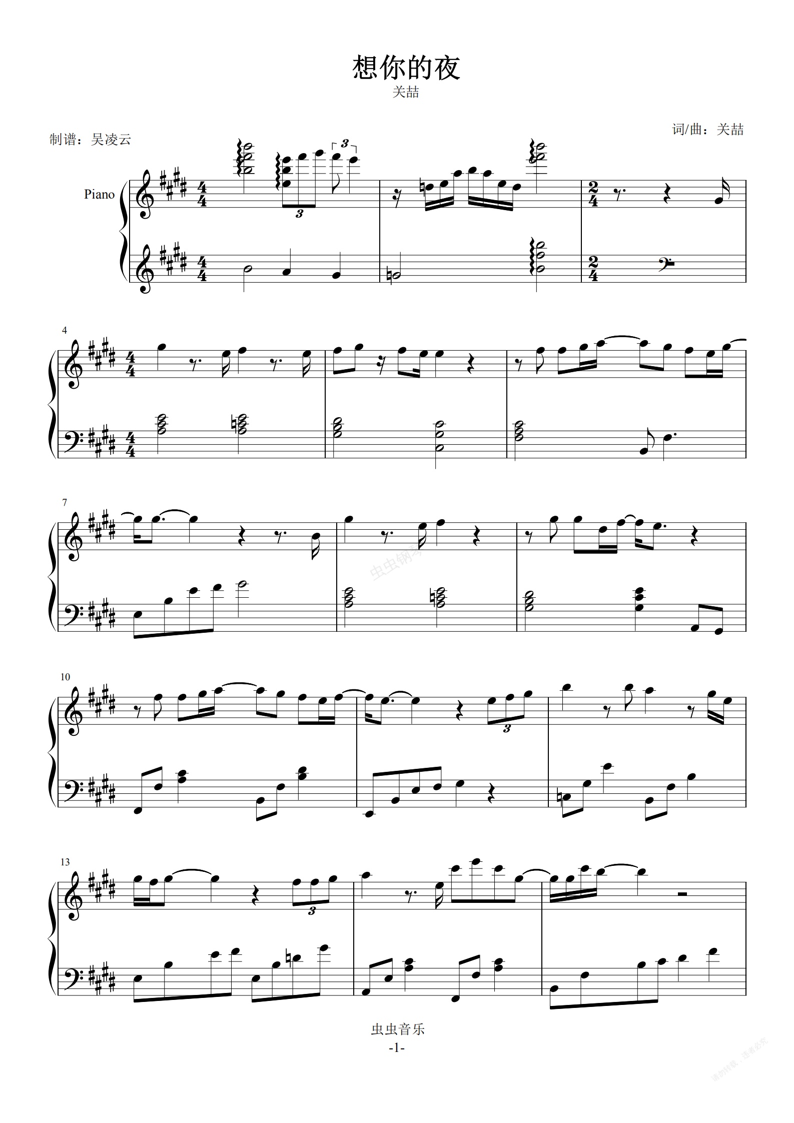 钢琴谱:想你的夜 关喆 吴凌云钢琴版